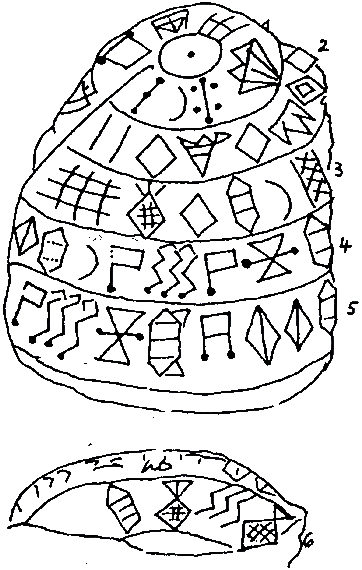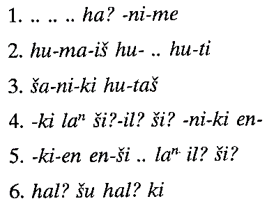 این نوشته به شدت آسیب دیده است و نمی توان آنرا معنی كرد. نشانه هایی ناشناخته نیز در آن دیده میشود. فعلا می توان آنرا به صورت زیر خواند