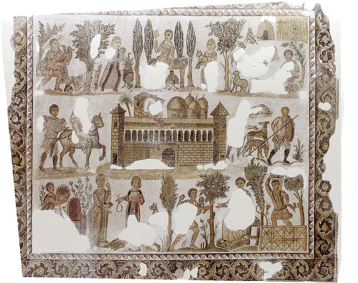 طرح فوق از یک خانه بدست آمده که در کارتاژ بوده و در تصویر آقا و خانم خانه در حال گرفتن هدایایی از مردم هستند. در کنار تصاویری نیز از زندگی روستایی به نمایش آمده است |
