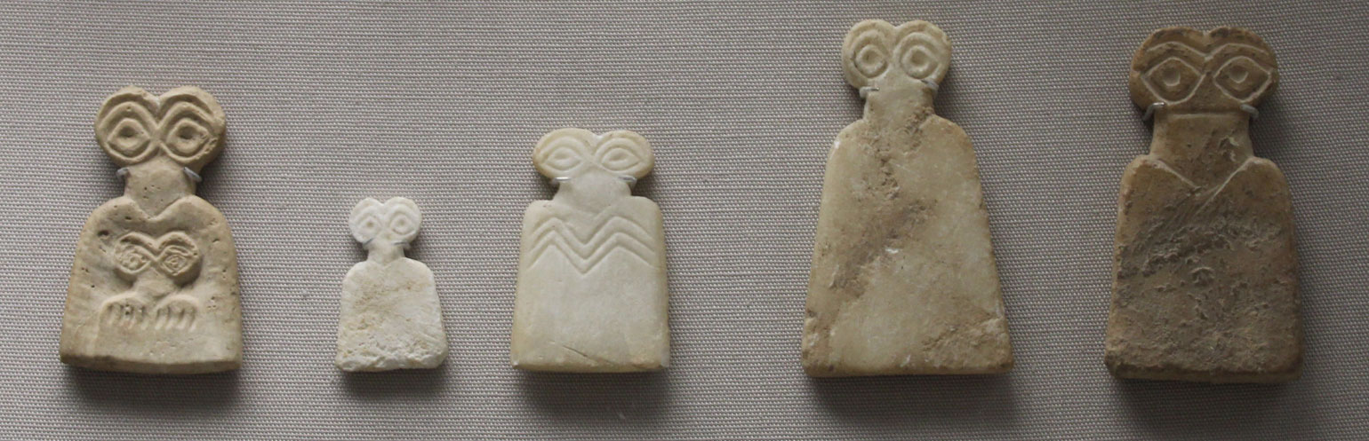 مجسمه های کوچک عمدتا سنگی با چشمان شاخص- تعداد بسیار زیاد این مجسمه ها درون معبد تل براک باعث نامگذاری بنا به معبد چشم از طرف باستان شناسان شد. دوره اوروک متاخر 3300 تا 3000 پ م - بریتیش موزه - تصویر حمید صدقی نژاد |
