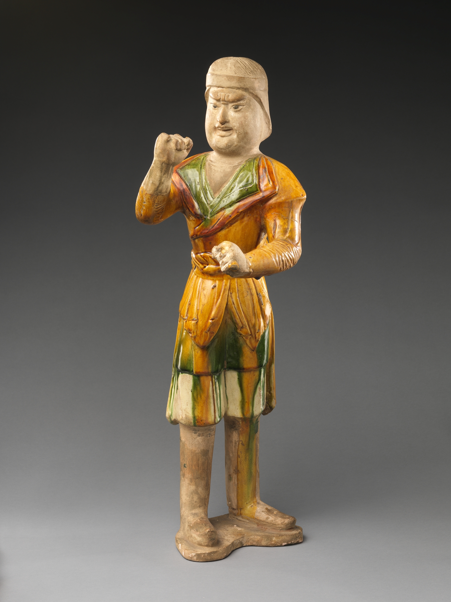مجسمه داماد با سفال رنگی- سلسله تانگ 618-907 میلادی- موزه متروپولیتنFigure of a Groom Period: Tang dynasty (618–907) Date: ca. late 7th–first half of the 8th century Culture: China Medium: Earthenware with three-color (sancai) glaze and pigments |