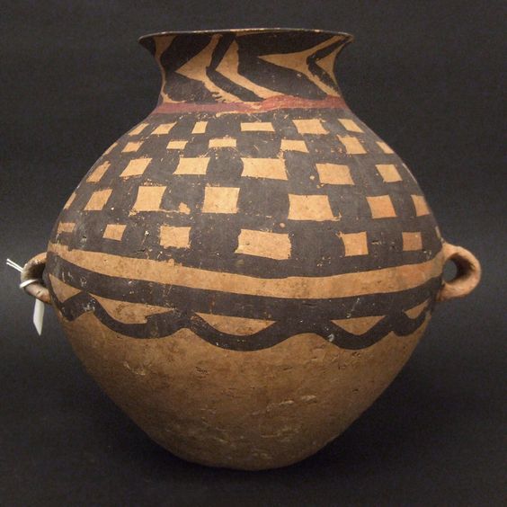 ظرف سفالی با دو دسته - فرهنگ ماجیایو چین- 2300 پ م موزه متروپولیتنA Chinese Neolithic Double-Handled Pottery Jar c.2300 - 2000 B.C. Machang Phase of Majiayao Culture from Gansu or Qinghai Province. The Buff-Orange Pottery Painted with Geometric Chequerboard Type Design |