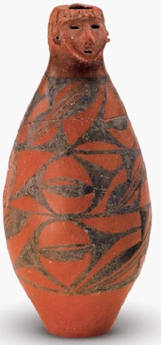Yangshao culture along the Yellow River. ca. 3000 BCE Gansu Province hand-formed Red pottery Jar with human head unearthed in Dadiwan. China.